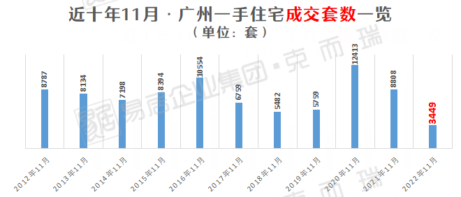 数据显示,11月广州商品住宅网签成交3449套,环比减少38%,同比减少61%,成为近十年即2012年以来同期新低。