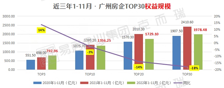 据克而瑞数据统计,今年1-11月,广州TOP30房企权益销售规模达1978.48亿元,同比下跌18%;TOP20权益规模1729.1亿元,同比下跌14%;TOP10权益规模1356.25亿元,同比下跌3%;TOP3是规模唯一同比上扬的梯队,792.96亿元,上涨14%。