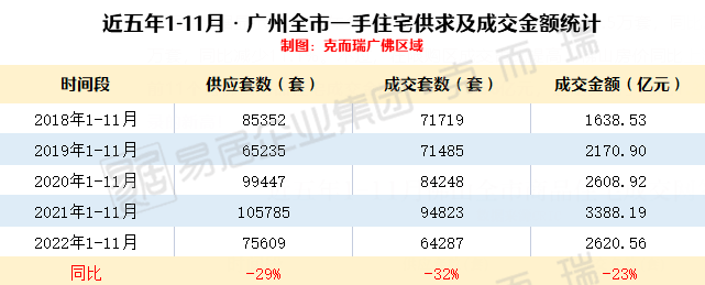 而从今年前11月的成交情况看,克而瑞数据显示,2022年1-11月广州全市供应商品住宅约7.6万套,同比减少29%;总计成交6.4万套,同比减少32%;不过,由于广州房价同比上涨以及改善需求的释放,今年前11月广州商品住宅揽金总计2620.56亿元,仍位列近五年同期第二高,仅次于去年同期!