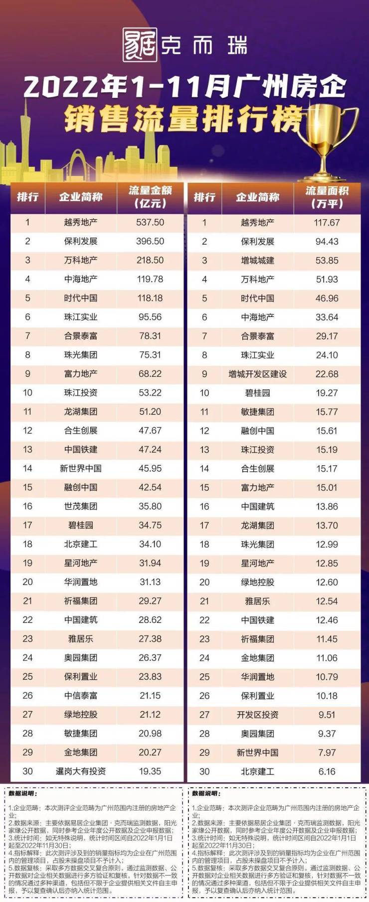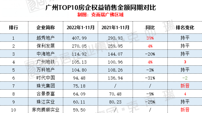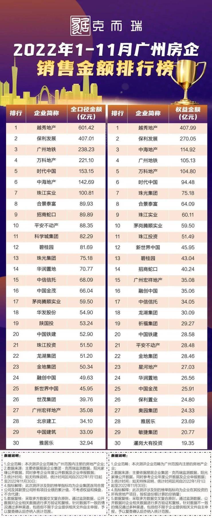 接下来我们将在克而瑞2022年1-11月广州房企销售TOP榜,揭晓正确答案!(注:下列榜单数据为商品房全口径,包含商品住宅+公寓+商业+办公)