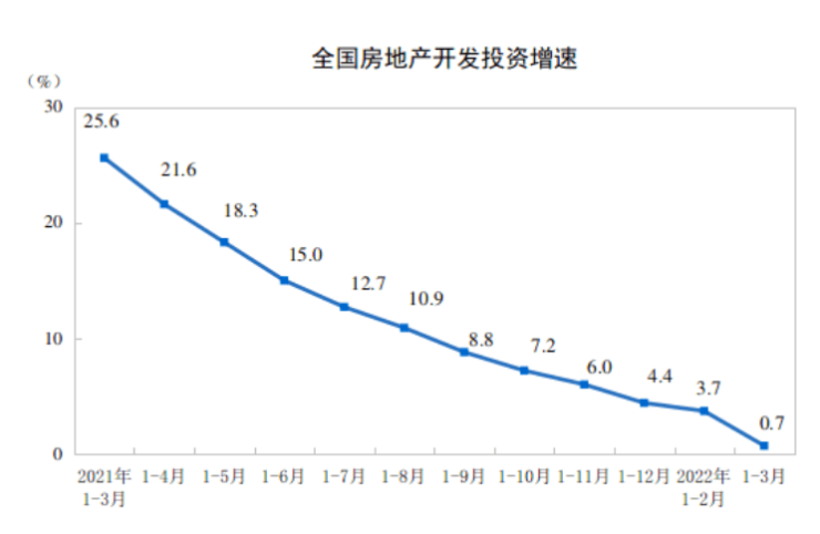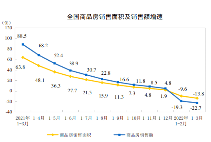 国家统计局公布《2022年1—3月份全国房地产开发和销售情况月度报告》,包含了一季度房地产开发投资完成情况、商品房销售和待售情况以及房地产开发企业到位资金情况三大内容。