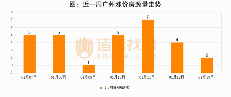 根据诸葛找房数据显示,广州24小时涨价房源量为2套,较01月12日减少2套,环比下降50%。与此同时,涨价房源占比小幅回落,对于购房者来说是一个入市窗口期,购房者可抓住时机入市。