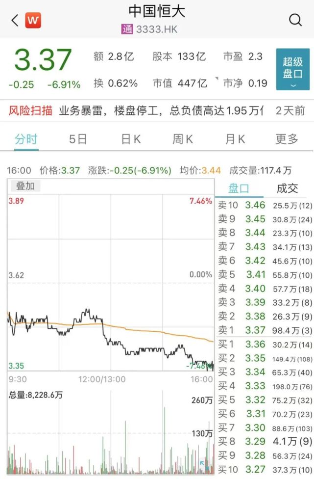 截至收盘,中国恒大下跌近7%,报价3.37港元/股,市值449亿港元;恒大汽车下跌超过7%,报价5.15港元/股,市值503亿港元;下跌2.55%,报价4.58港元/股,市值495亿港元。