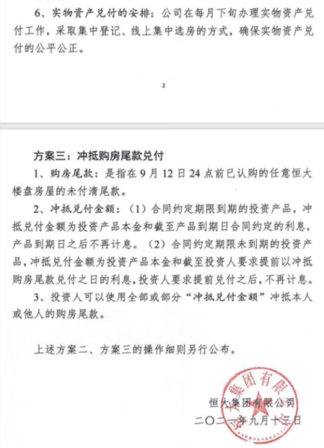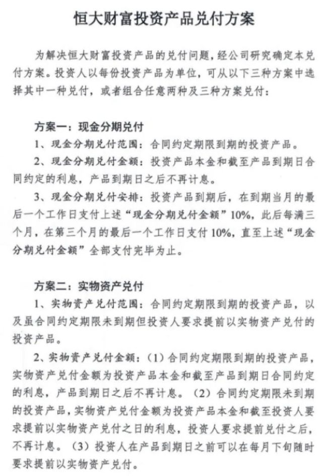 面对汹涌的线下投资者,9月13日,恒大财富兑付方案已经面向投资者出炉,共有3种方案,一种是现金分期兑付方式,一种是实物资产兑付方式,还有一种为冲抵购房尾款兑付。
