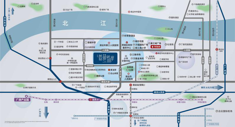 项目选址清远市清城区核芯地段,涵盖商业、教育、医疗、市政等醇熟配套。项目还坐享多维立体交通路网,广清城轨(在建中)3站直达广州,武广高铁纵横珠三角,迅捷出行。