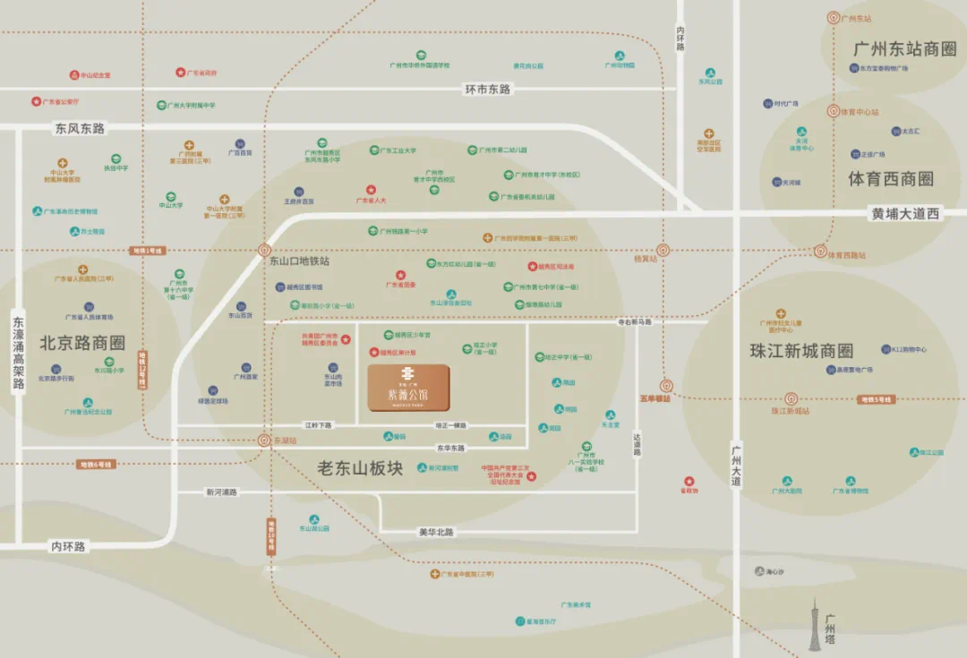 项目沙盘实地·紫薇公馆位于广州老东山东华东路龟岗大马路路口东侧,东接天河,西接越秀老区,地理位置不可复制,加上近年来越秀区土地供应十分稀少,项目周边配套设施完善。
