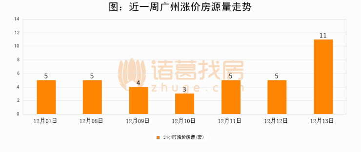 根据诸葛找房数据显示,广州24小时涨价房源量为11套,较12月12日增加6套,环比上涨120%。与此同时,涨价房源占比小幅扩大,业主信心有所提升。