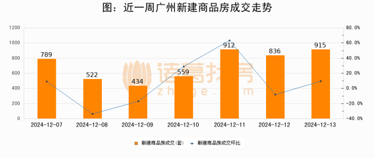 根据广州市住房和城乡建设局数据显示,2024年12月13日广州新建商品房成交915套,较昨日增加79套,环比上涨9.4%