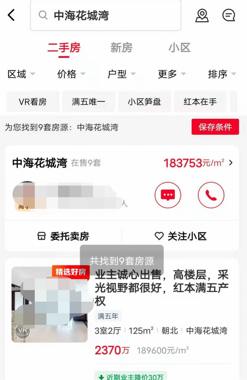 在贝壳APP上“消失”的中海花城湾,图源中原地产APP