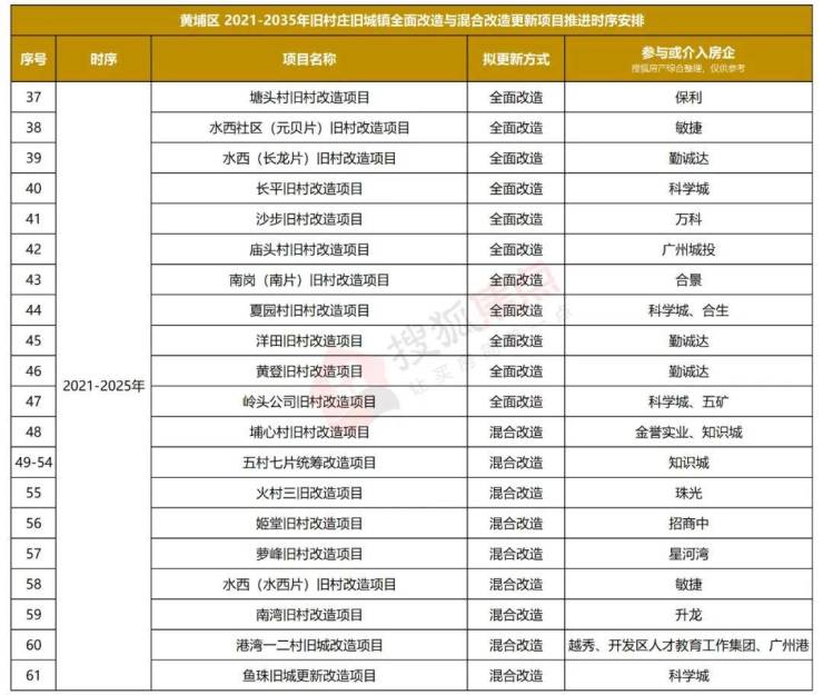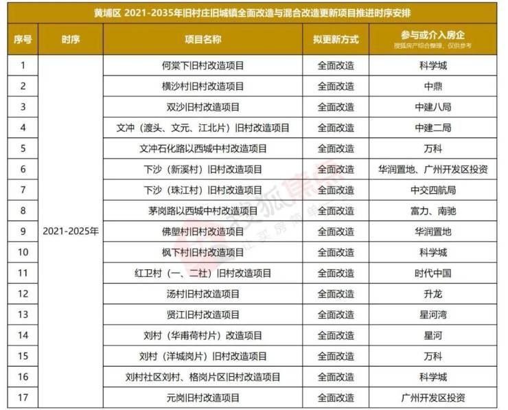 细看黄埔区2021-2035年旧村庄旧城镇全面改造与混合改造更新项目推进时序安排。在列的76个项目中,61个的推进时序安排在2021-2025年,其他安排在2026-2035年。