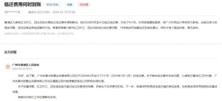据官方2024年3月答复,九佛街已督促红卫村村委、广州合景决胜置业发展有限公司与区属国企现代能源集团恒运公司积极协调处理红卫村三、四社费用问题。