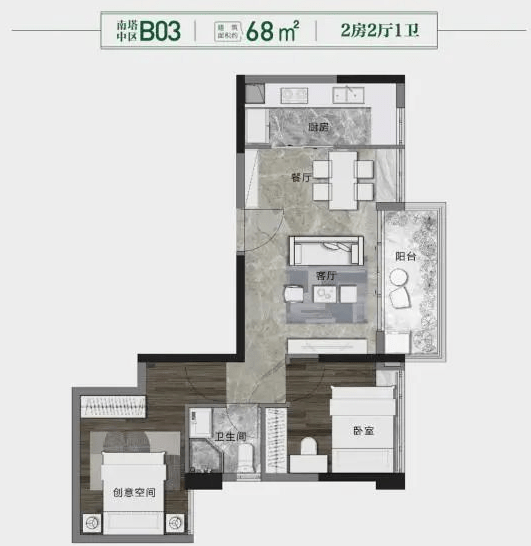 就目前流出的户型图来看,建面约68㎡两房两厅,采用横厅设计,动静分区明显。