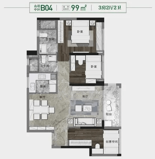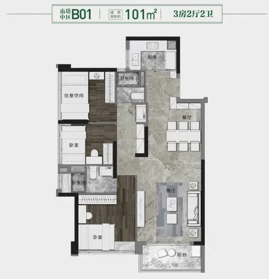 还有建面约99㎡、101㎡三房,户型方正实用,餐客厅阳台一体连通,主要的区别在于朝向。