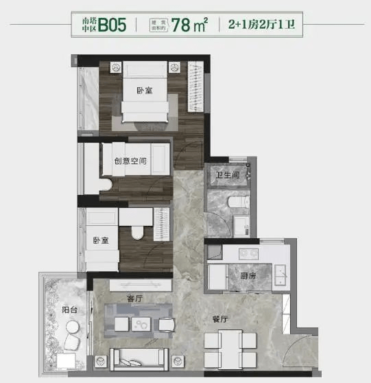 另建面约78㎡2+1房,采用N+1多变灵动空间,可改成小三房,空间利用率高。