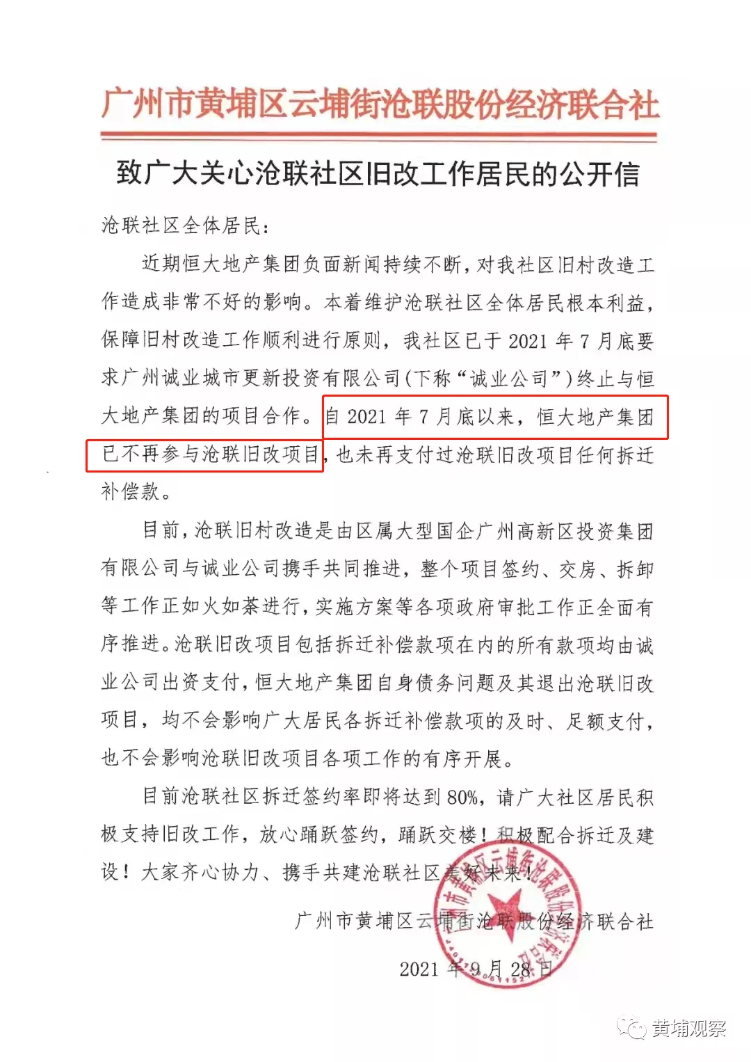 近日,黄埔区云埔街巨无霸旧改项目沧联社区深夜发文,宣布终止与恒大的合作。