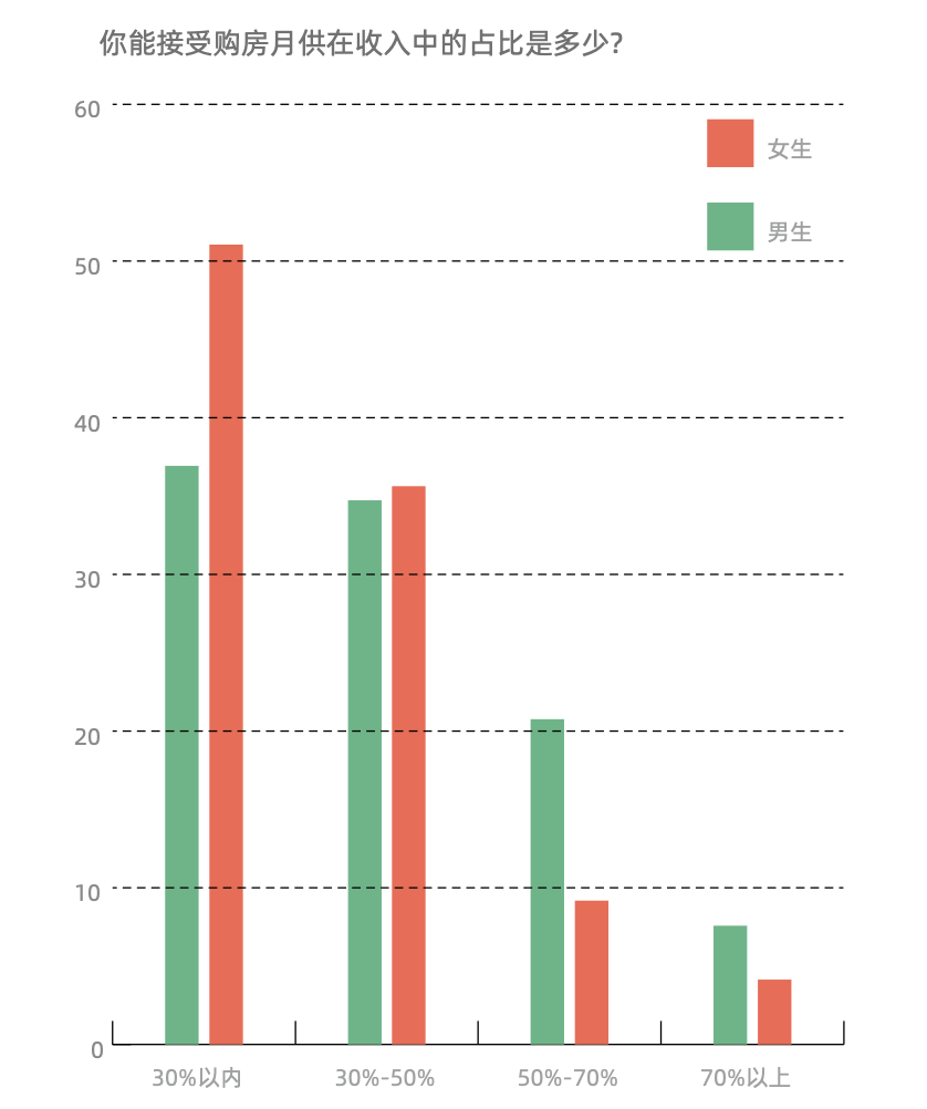 首付之后,月供也是压在部分女性身上的大山。报告显示,过半女性受访者对月供的承受能力在收入的30%以内。男性对月供压力上的忍耐力明显高于女性,20.76%的男性可以承受月供占收入的五成至七成,7.58%的男性可以承受月供占收入的七成以上,而女性对这两项的选择占比分别为9.18%和4.14%。