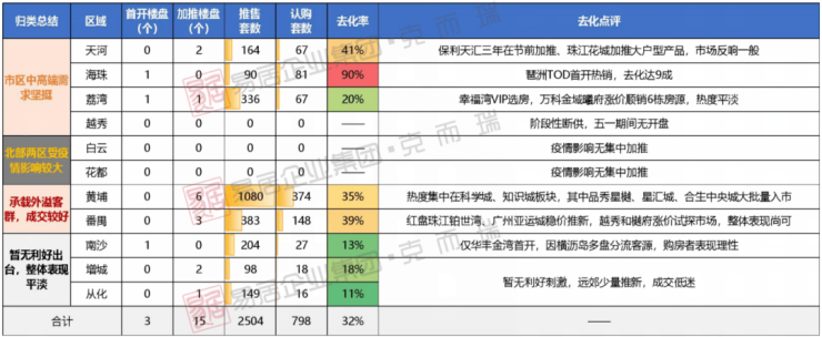 若分区域来看,中心城区去化率自然不用多讲,而坐拥近郊优势的黄埔、番禺同样也受外溢客群追捧,甚至不少项目还涨价加推试探市场。可见,市场恢复还算不错,有机会冲击“5月小阳春”