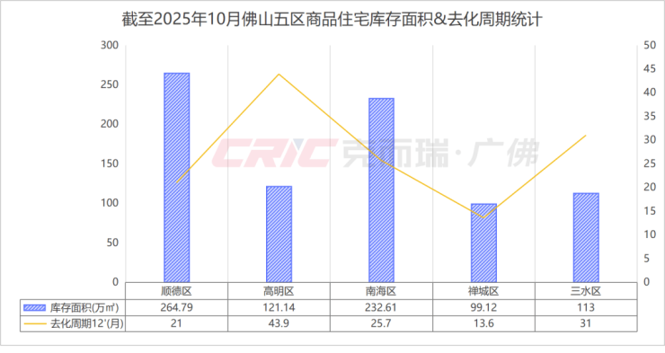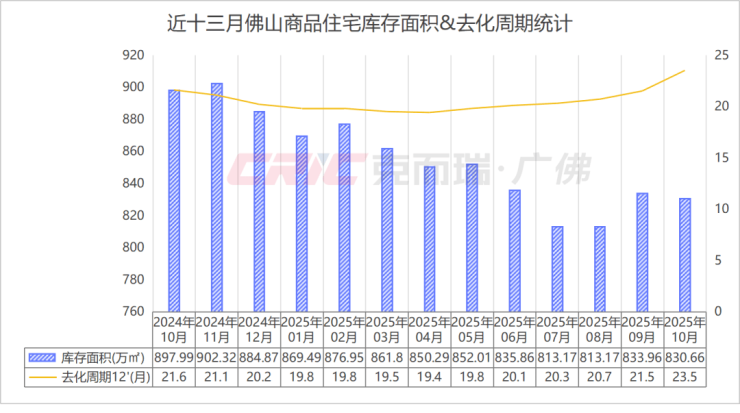 克而瑞数据监测显示,截至2025年10月末,佛山商品住宅库存面积830.66万㎡,创下近五年最低,尽管库存规模有所下降,但去化延长至周期23.5个月,为近五年来最高。
