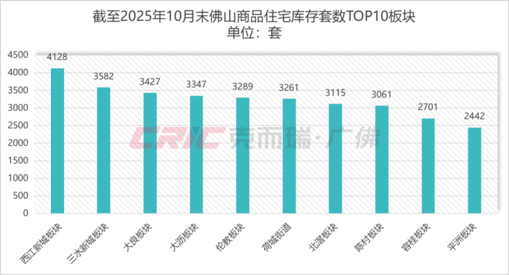 在库存套数方面,克而瑞数据监测显示,截至2025年10月末库存套数超千套的项目有25个板块,较去年同时期减少4个,其中西江新城板块、三水新城板块、大良板块依次包揽板块库存规模前三,其可售套数依次为4128套、3582套、3427套。