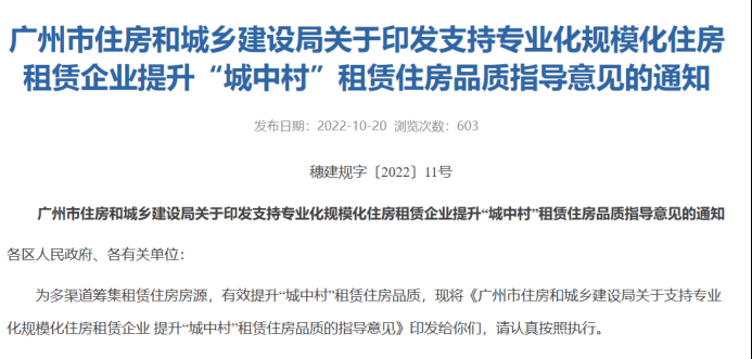 为多渠道筹集租赁住房房源,有效提升“城中村”租赁住房品质,《广州市住房和城乡建设局关于支持专业化规模化住房租赁企业提升“城中村”租赁住房品质的指导意见》正式印发。