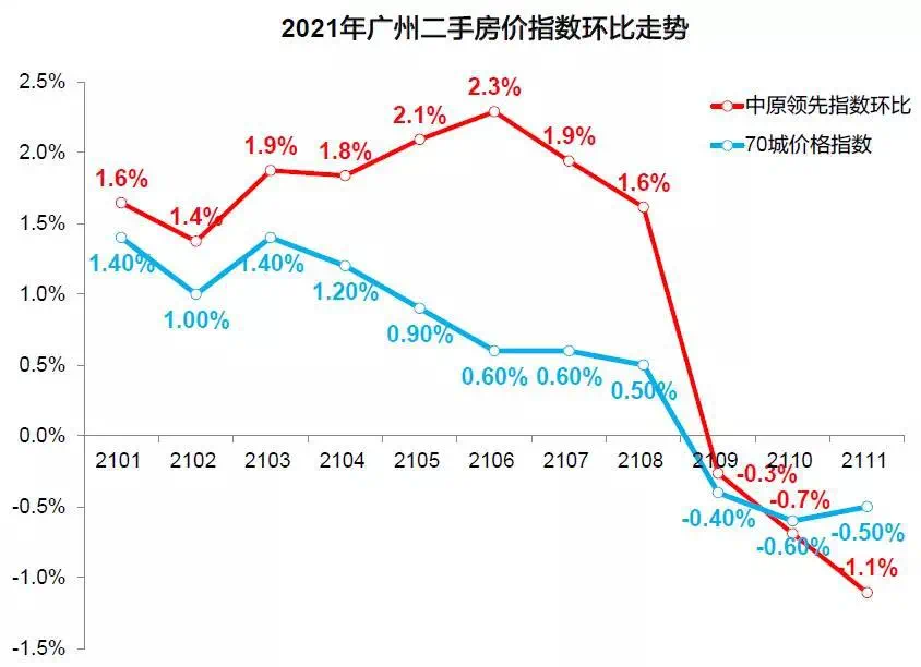 值得关注的是,从2021年5月份开始,广州一手房价涨幅持续下降,8月份跌破0点,现已呈现连续5个月负增长。