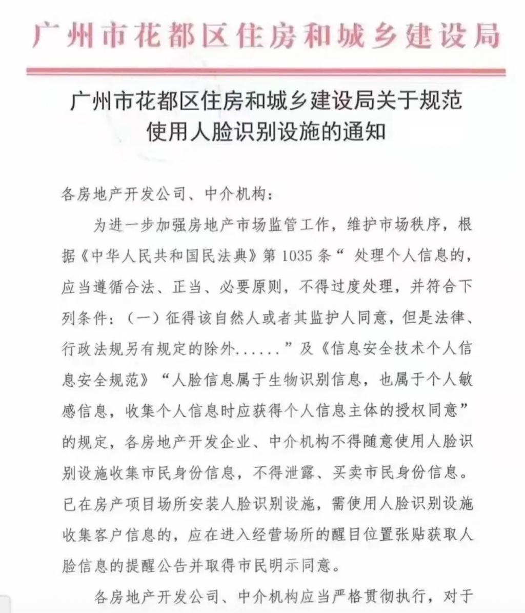 昨日,一则关于《广州市花都区住房和城乡建设局关于规范使用人脸识别设施的通知》传出,通知提及各房地产开发企业、中介机构不得随意使用人脸识别设施收集市民身份信息,不得泄露、买卖市民身份信息。已在房产项目场所安装人脸识别设施,需使用人脸识别设施收集客户信息的,应在进入经营场所的醒目位置张贴获取人脸信息的提醒公告并取得市民明示同意。