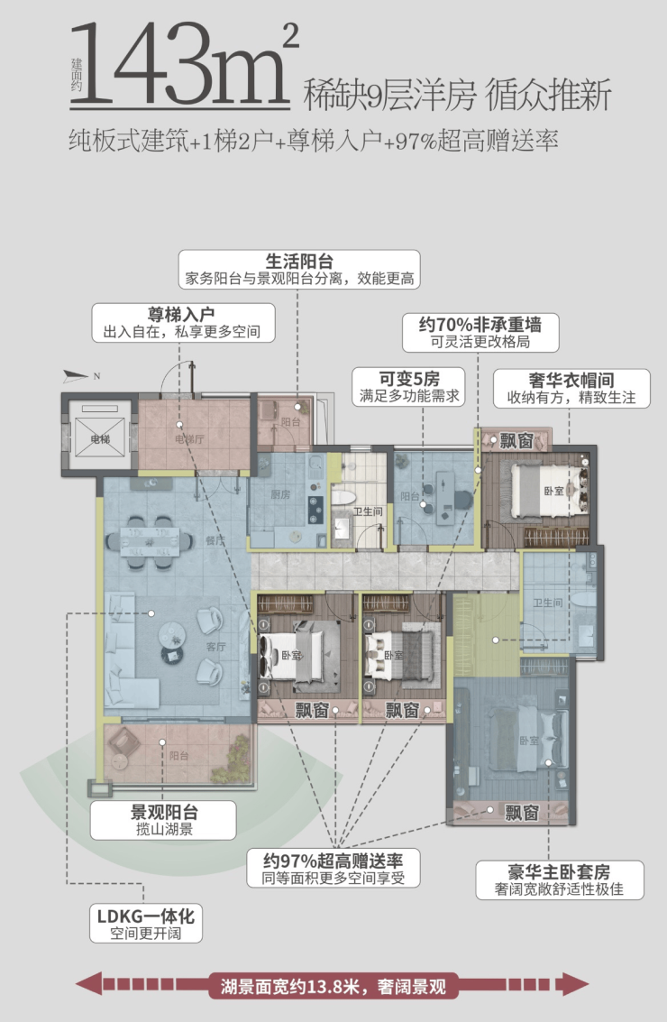建面约128㎡稀缺湖景洋房,南北通透,视野开阔无遮挡,近观山湖园林,南望珠江新城CBD景观,盛揽春日万般明媚,打造诗意的日常生活,让每一户都能拥有一扇价值千万的IMAX窗景。