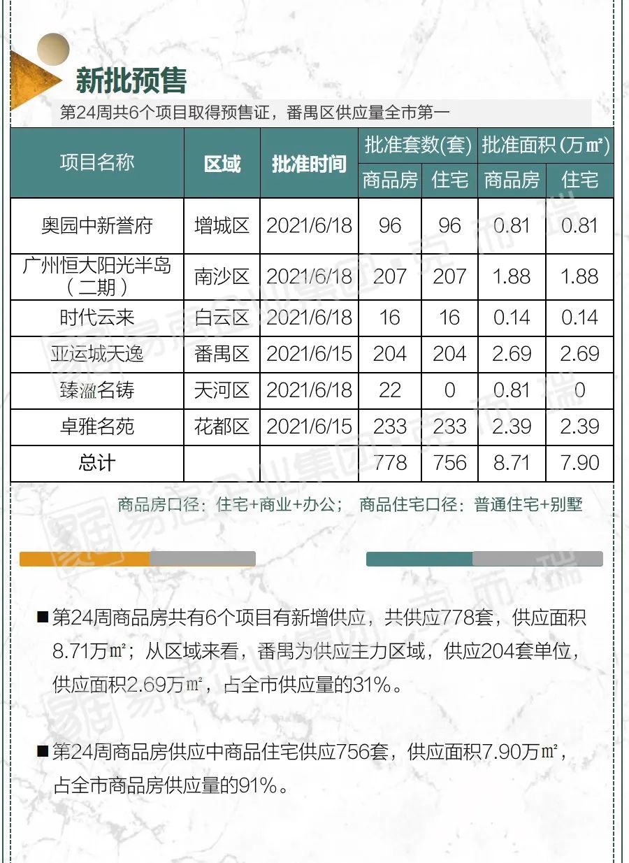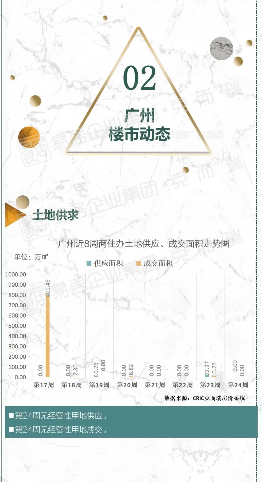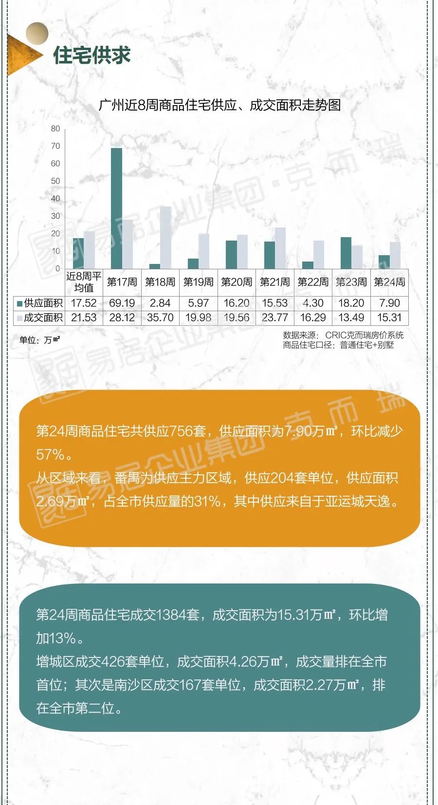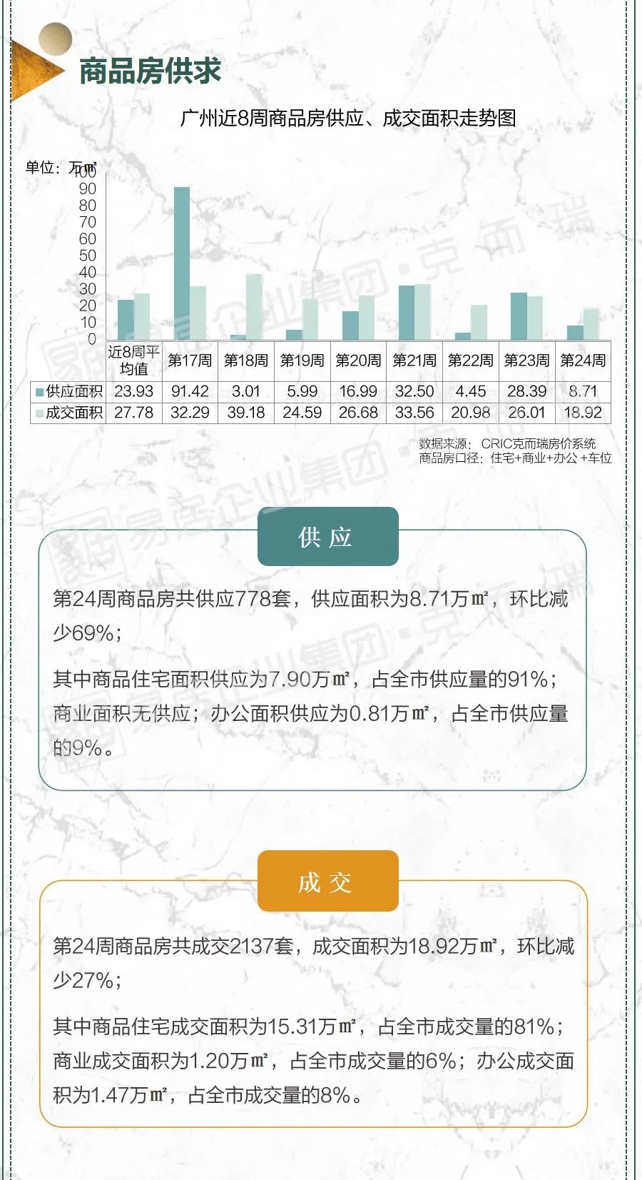 克而瑞市场监测到,第24周广州共有6个项目有新增供应,合计新房供应756套,供应面积为7.90万㎡,环比减少57%。
