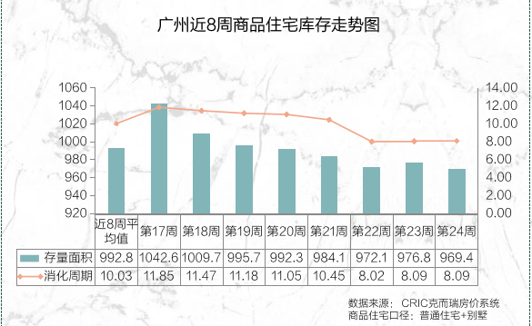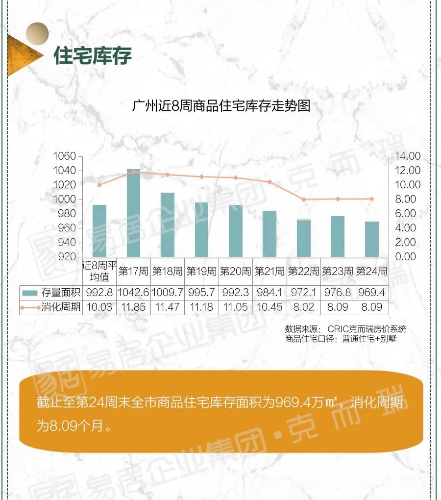 值得一提的是,从周次新房去化周期看,截止至第24周末全市商品住宅库存面积为969.4万㎡,消化周期为8.09个月。