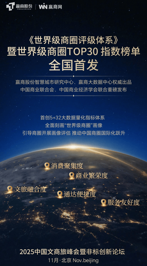 赢商股份智慧城市研究中心、赢商大数据中心联合中国商业联合会、中国商业经济协会,重磅打造《世界级商圈评级体系》暨世界级商圈TOP30指数榜单全球首发!该体系首创5+32大数据量化指标体系,从消费聚集度、商业繁荣度、文旅融合度、通达便捷度、服务友好度五大维度,全面刻画”世界级商圈“画像,引导商圈开展画像评估,推动中国商圈国际化跃升。