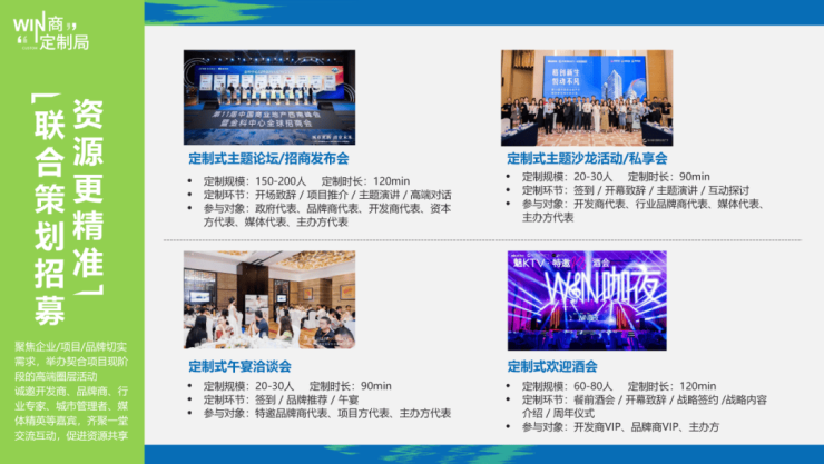 依托大会影响力与稀缺资源平台,为企业提供深度战略赋能解决方案。基于项目筹开、调优等核心需求,量身构建品效合一的推广活动矩阵,精准制导潜在合作方触达;同步嫁接大会资源通路,驱动项目与品牌从资源精准对接到合作共建,实现商业价值的高效兑现。