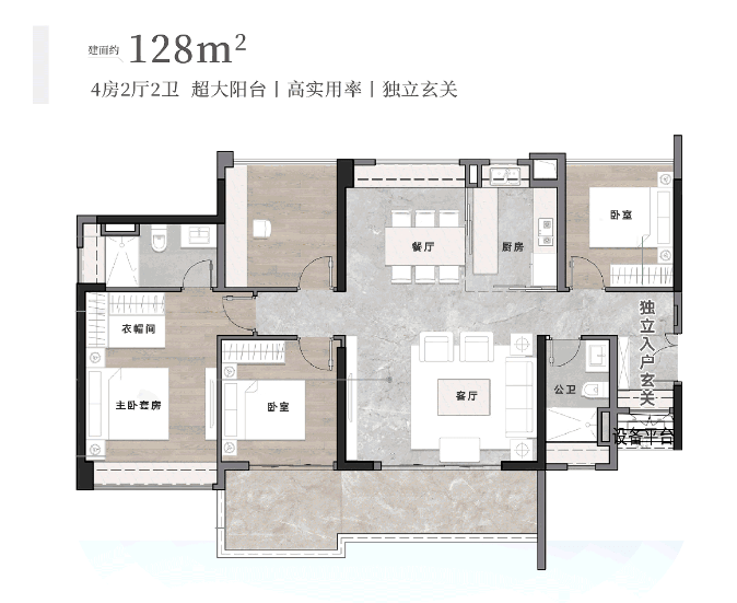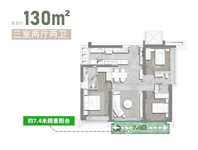 白鹅潭悦府建面约130平的户型,阳台长度达到了7.4米!这是比较常见的双联阳台,联通了客厅和次卧,使得房子的景观面更大。