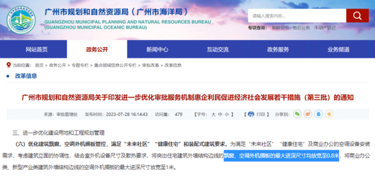 无独有偶,7月28日印发的《进一步优化审批服务机制惠企利民促进经济社会发展若干措施(第三批)》提出,为满足“未来社区”“健康住宅”及商业办公的空调设备安装需求,飘窗、空调外机搁板的最大进深尺寸均放宽至0.8米。