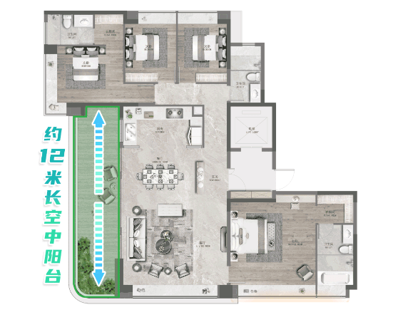 更绝的还是长岭雅居,建面约190㎡户型阳台长达约12米,妥妥的跑道阳台!而且项目的进深达2.4米,长且深的阳台,除了实用性外,还能满足养花种草、休息健身等功能,生活幸福感大大提升。