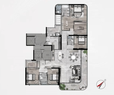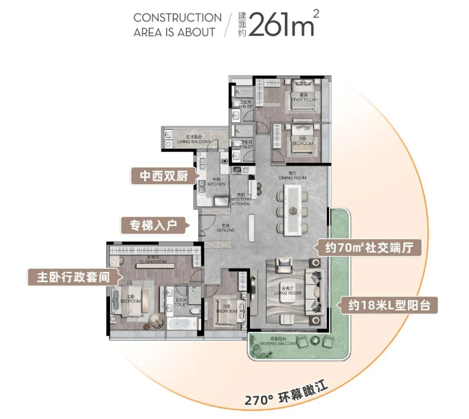 横沥岛的西派澜岸也有异曲同工之妙,同样追求江景最大化。建面约261㎡户型的L型阳台长度达到了18米,江景一览无遗。同时该户型还是双阳台的设计,日常生活与诗意互不干扰。