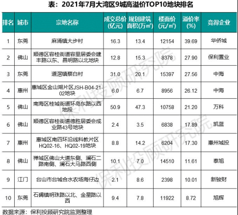 7月TOP10溢价率门槛仅为8.7%,TOP 3的宅地来自佛山及东莞。华侨城以近40%溢价率竞得东莞麻涌镇地块,高居榜首;中海竞价积极,以28%溢价率分别竞得东莞道滘镇及惠州惠城地块。