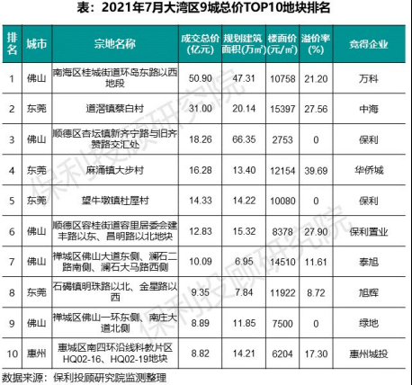 从总价门槛来看,7月TOP10门槛为8.8亿元,其中佛山南海桂城地块总价高达50.9亿元,东莞道滘镇地块及佛山顺德杏坛地块以31亿元、18.3亿元分列二三。