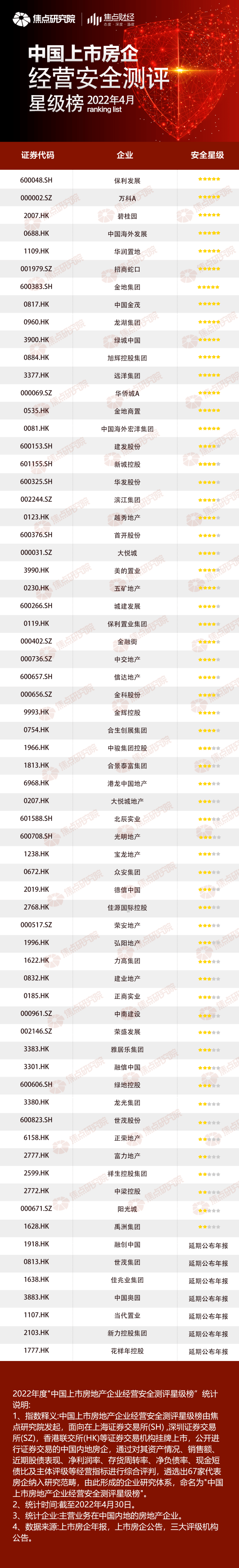 中国上市房企经营安全测评 :67家企业入围,仅22%获评5星(2022年4月)
