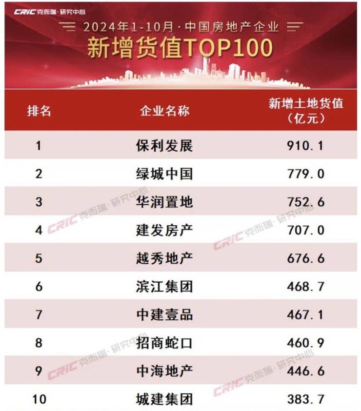 克而瑞研究中心发布的报告显示,今年前10个月,保利发展(600048.SH)新增土地货值910.1亿元,排名第一。紧随其后的是绿城中国(03900.HK)新增土地货值779亿元,华润置地(01109.HK)新增土地货值752.6亿元。