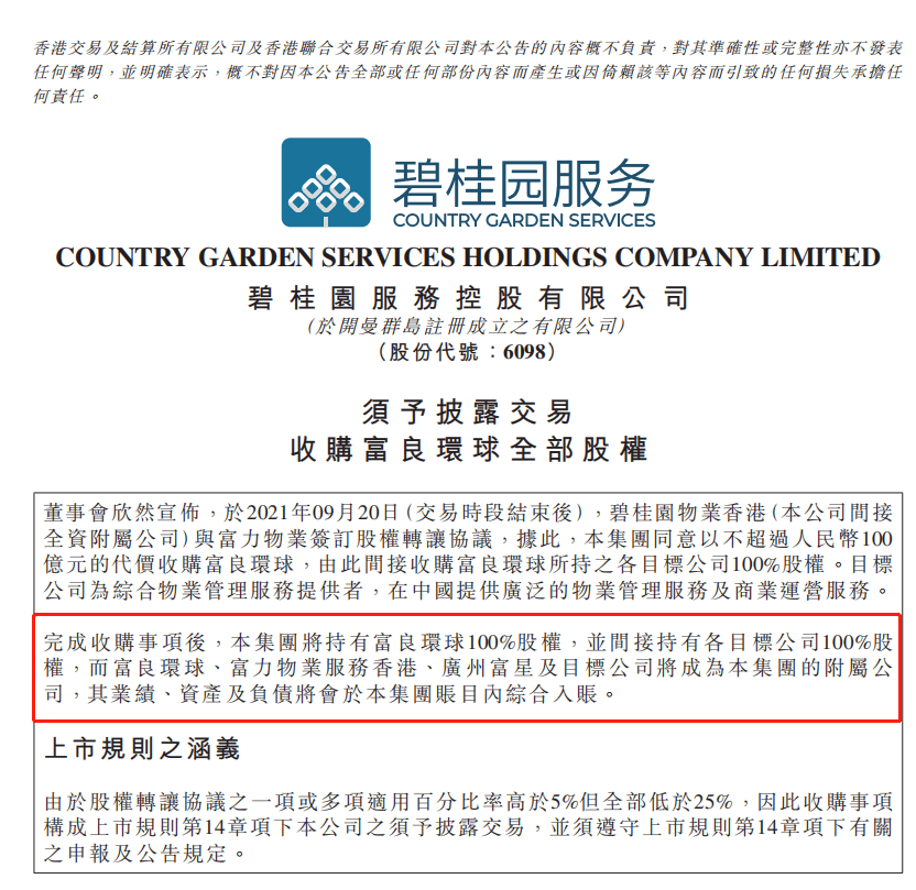 9月20日晚,碧桂园服务控股有限公司(下称“碧桂园服务”)公告称,碧桂园物业香港与富力物业签订股权转让协议,以不超过100亿元收购富良环球100%股权。