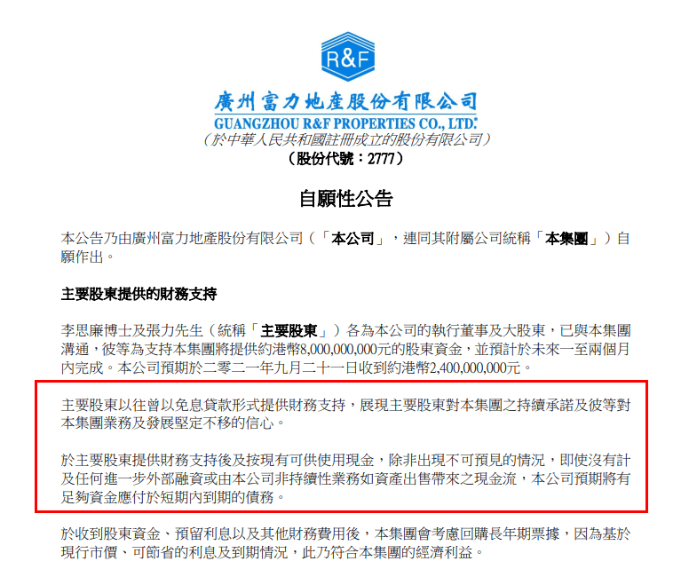 就在昨天出售富良环球之际,富力集团亦公告宣布公司的执行董事及大股东李思廉、张力,为支持富力集团将提供约80亿元港币的股东资金,预计未来一至两个月内完成,今日(21日)将收到港币约24亿元。