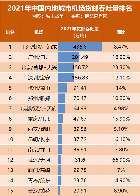 2021年,上海两大机场的货邮吞吐量达到436.6万吨,在内地城市中排名排名前列名。