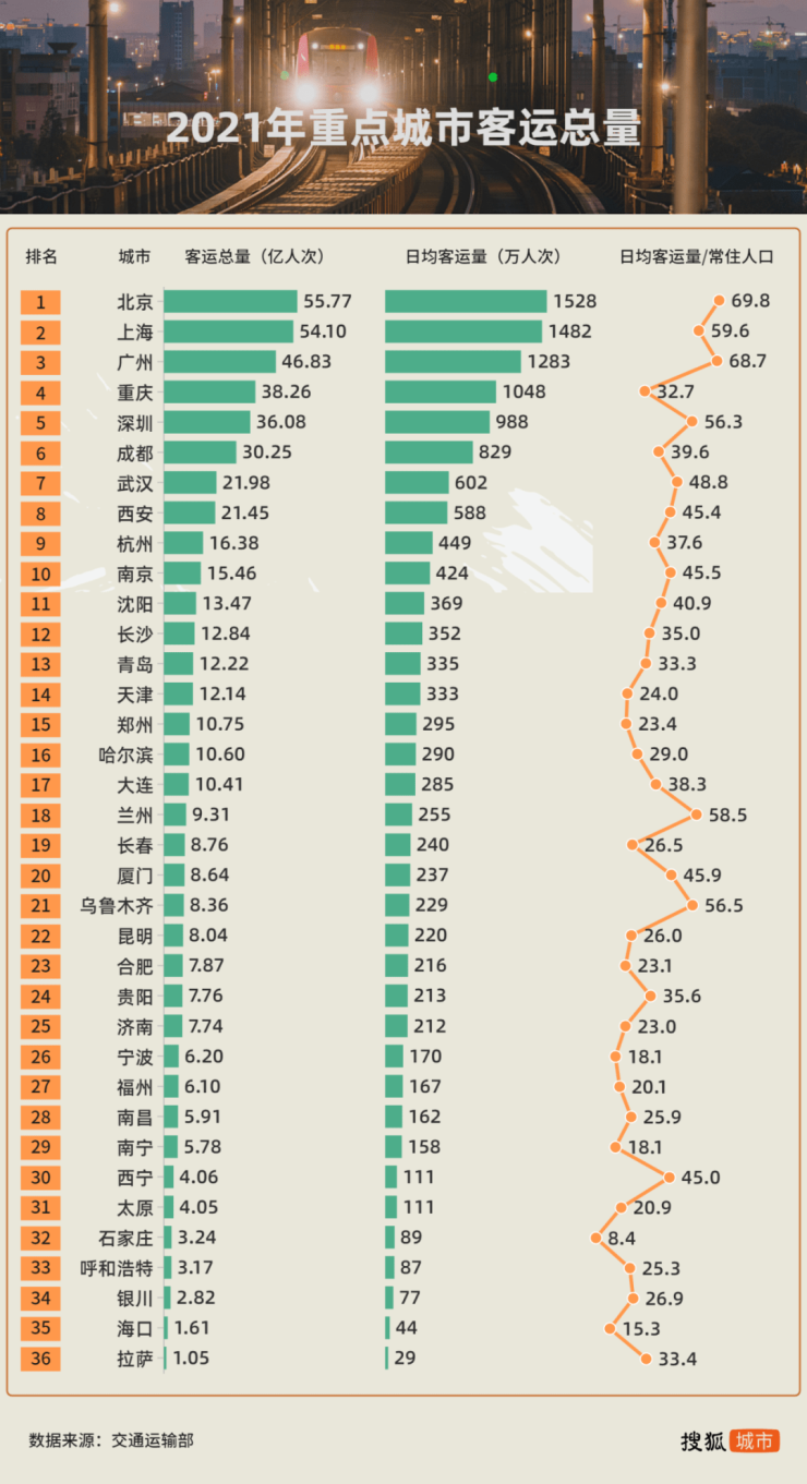 从这些数据可以发现,头部城市的格局清晰可见,2021年北京、上海、广州三个城市的总客运量均超过40亿人次,稳居排名前列梯队。