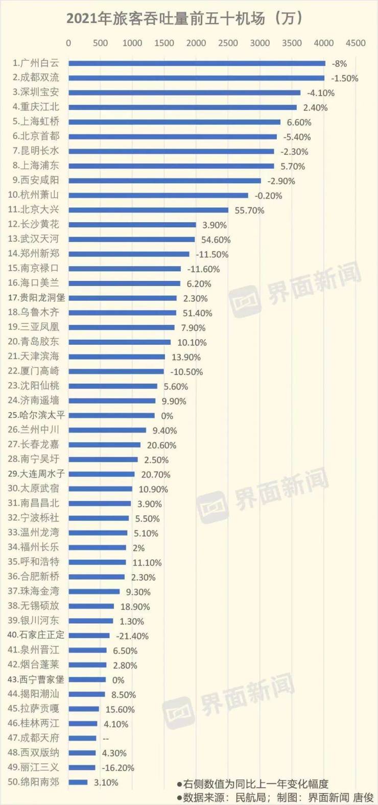 3月份,中国民航局发布了《2021年全国民用运输机场生产统计公报》,以下为各大机场旅客吞吐量排名👇