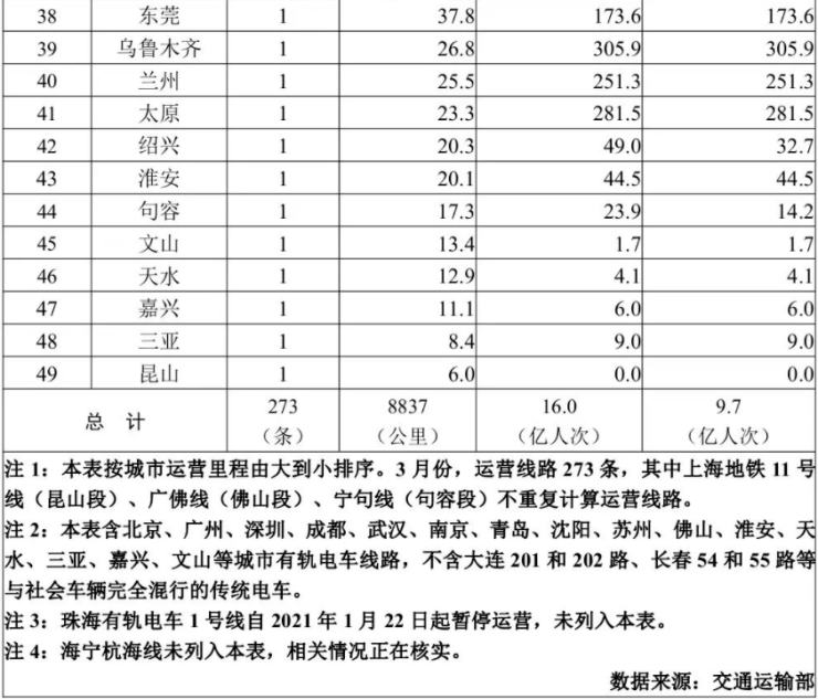 以下是交通运输部发布的2022年3月份城市轨道交通运营数据,这里的轨道交通包含地铁、有轨电车、磁浮交通等,其中地铁里程占大头: