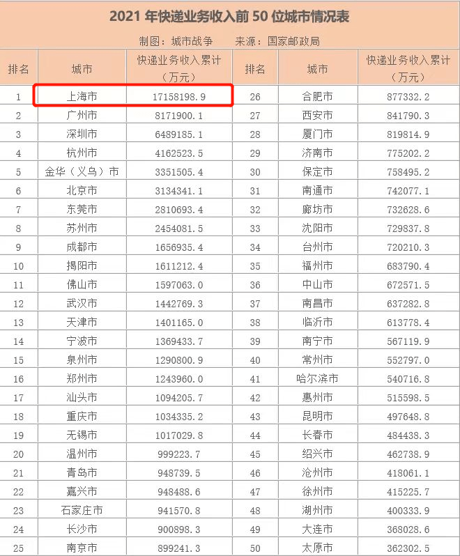 此外,上海机场货邮吞吐量遥遥先进,说明上海的国际化程度的确很高,国际快递多,使得上海每年的快递业务收入也是全国遥遥先进。