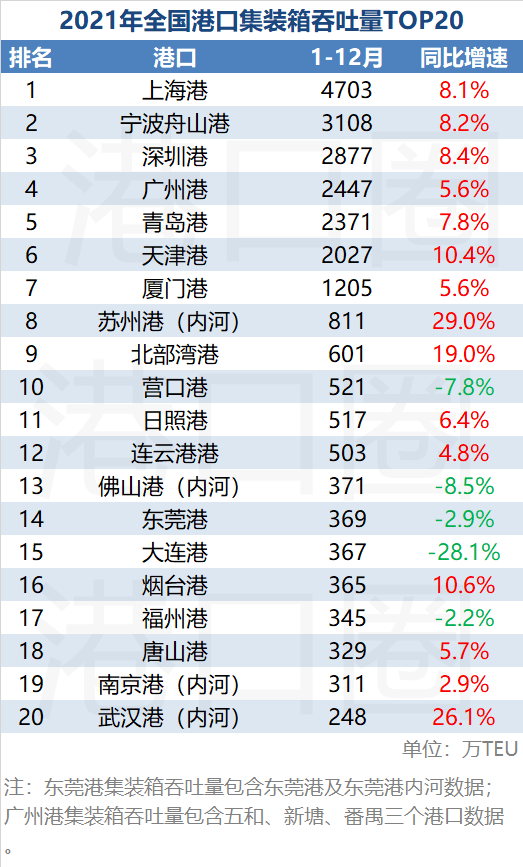 以下为2021年各大城市港口集装箱吞吐量TOP20