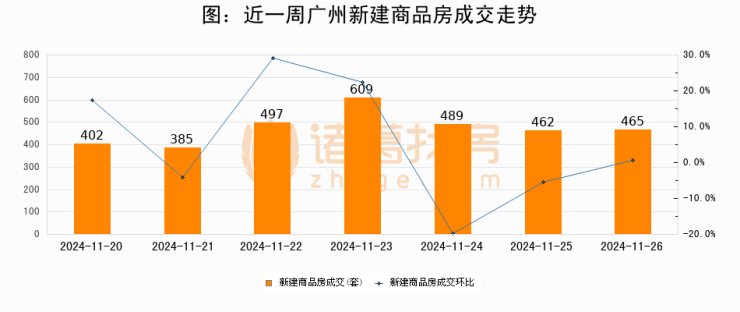 根据广州市住房和城乡建设局数据显示,2024年11月26日广州新建商品房成交465套,较昨日增加3套,环比上涨0.7%