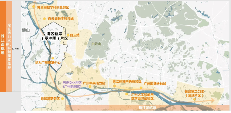 "湾区新岸“规划面积约22.8平方公里,西临珠江西航道,东边是广州白云站枢纽,北边是白云湖数字科技城,南边是白鹅潭商务区。