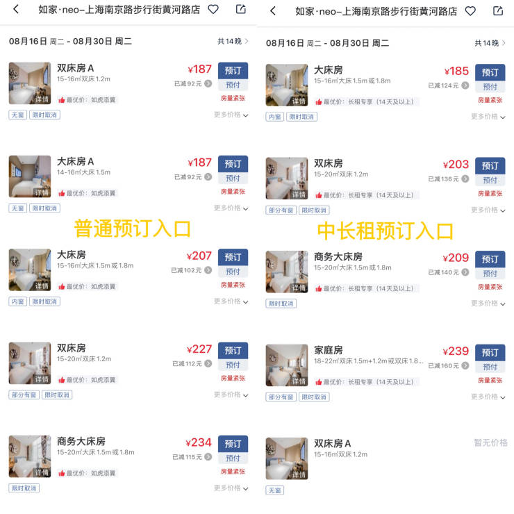 澎湃新闻搜索首旅如家APP发现,以如家·neo上海南京路步行街黄河路店为例,从普通预订入口预订8月16日至8月30日入住共14晚的大床房价格为207元/晚(仅入住一晚价格也相同);而从中长租预订入口预订同样时长的大床房价格为185元/晚,长租价格为门市价的9折左右。同一酒店普通预订与长租预订价格对比。